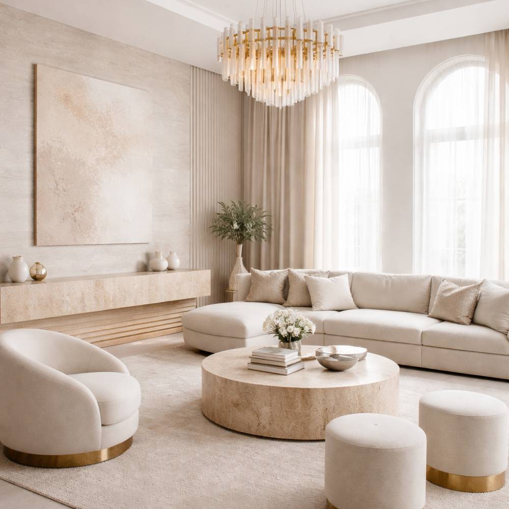 Shift toward warmer evening tones and softer diffusion. Introduce sculptural fixtures that create atmosphere rather than glare. Let shadows soften corners. Allow illumination to feel architectural, not decorative.